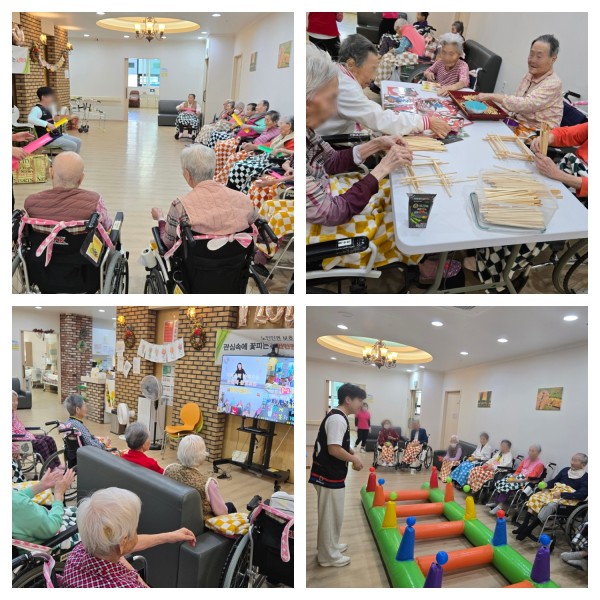 - 매주 월요일, 목요일 여가활동으로 민요교실, 신나는소리마당으로 흥겨운 애창곡을 불러 보았습니다.- 매주 화요일 레크레이션 신체활동으로 오른손 올리고, 왼손 내리고~ 신나게 활동을 하였습니다.- 매주 수요일, 금요일 인지활동으로 교구를 이용하여 그림퍼즐, 나무젓가락 쌓기 등 인지기능훈련을 하였습니다.